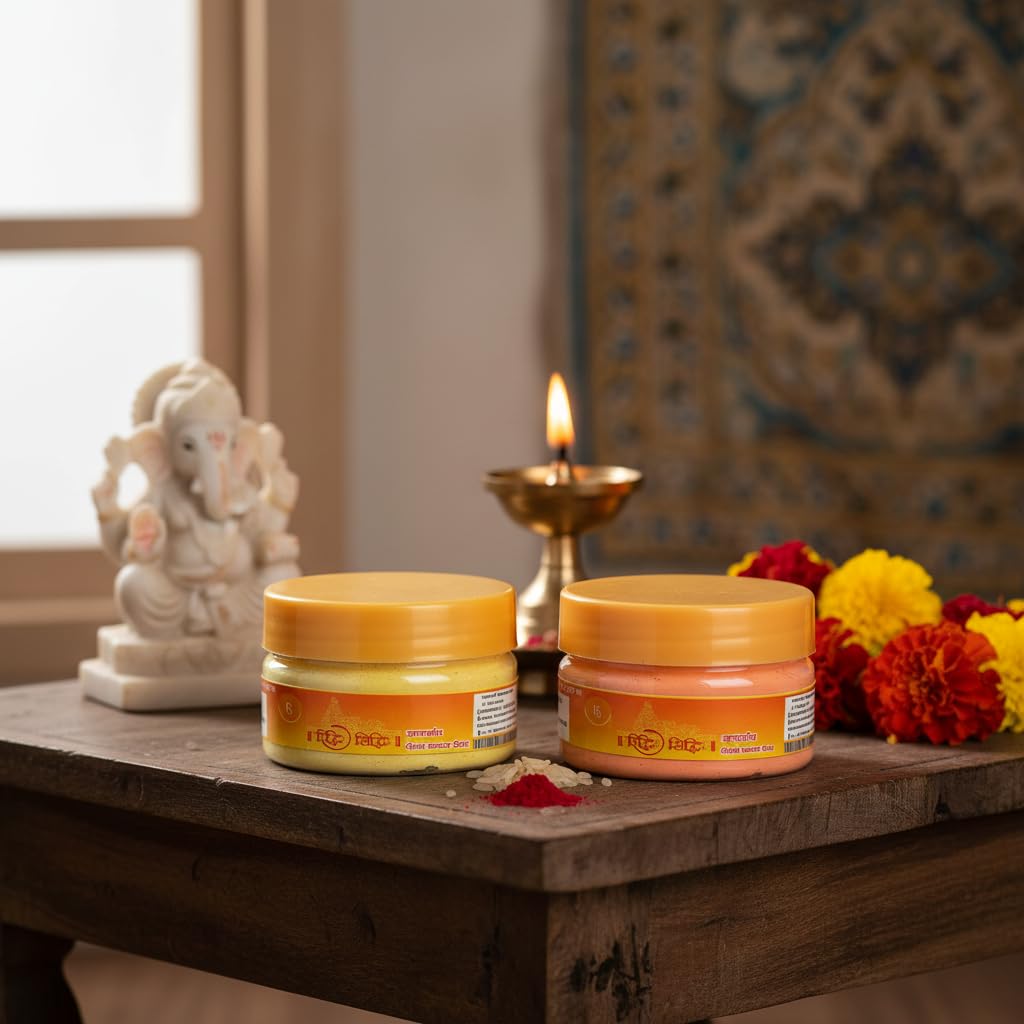 Our Chandan & Kesari Chandan Tilak Powder Set is crafted from the finest natural sandalwood and saffron-inspired ingredients, ensuring each application embodies purity and tradition. Designed for ease of use, the soft, fine powders glide smoothly onto the skin, making your tilak and ritual preparations effortless and precise. Elevate your daily worship, temple ceremonies, and festive celebrations with the authentic aroma and vibrant hues that foster a peaceful, spiritual environment in your home or place of worship.