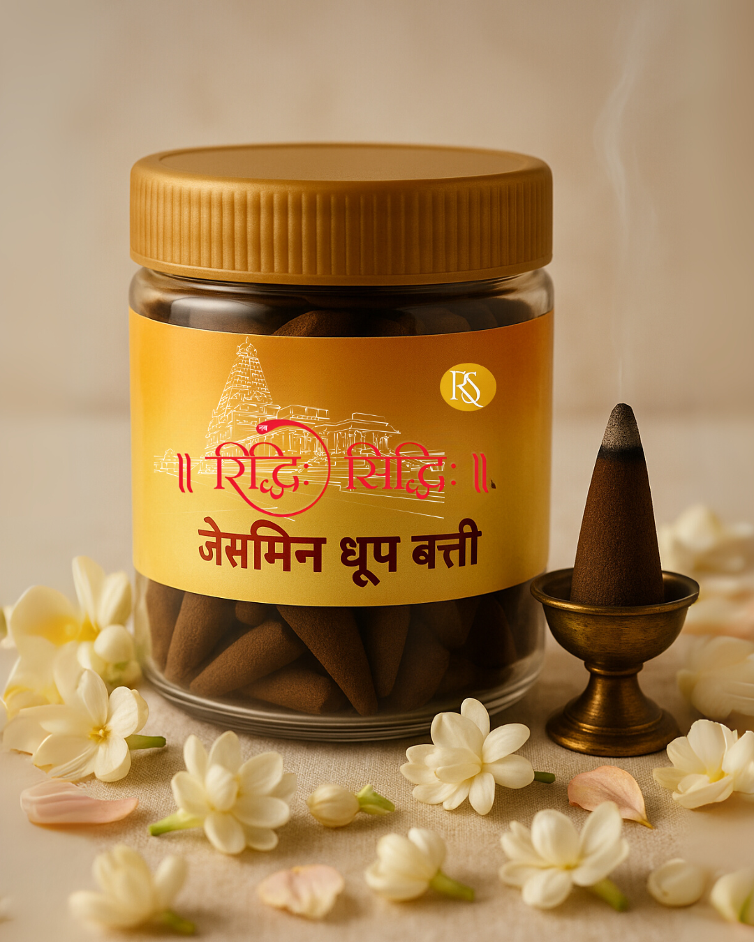 Let the delicate sweetness of mogra (Arabian jasmine) turn every corner of your home into a tranquil sanctuary. Nav Riddhi Siddhi Jasmine Dhoop Batti is lovingly hand-rolled from pure jasmine blossoms, plant-based resins, and sacred herbs, delivering a soft yet lingering fragrance that soothes the mind, lifts the spirit, and invites blessings into daily pooja and meditation.