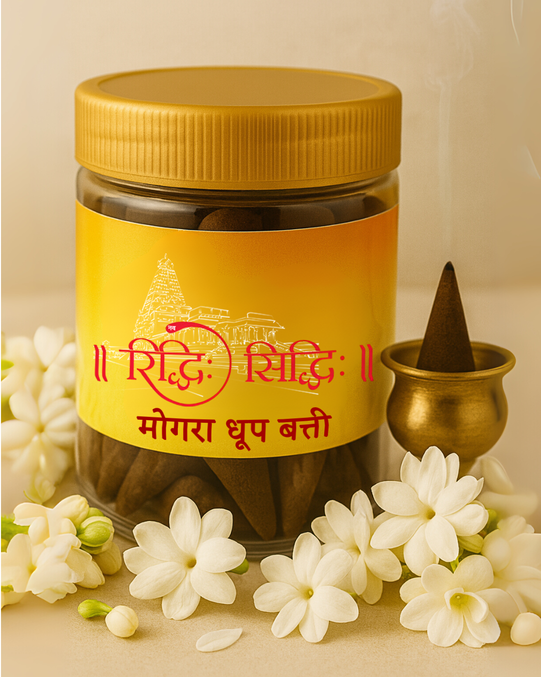 Picture a warm summer evening when blooming jasmine (mogra) perfumes the air — that soft, nostalgic scent is exactly what each handcrafted cone of Nav Riddhi Siddhi Mogra Dhoop Batti delivers. Made from sun-dried mogra petals, plant-based binders, and a hint of pure jasmine essential oil, this incense brings instant serenity to daily pooja, meditation, or simple “me time” at home.